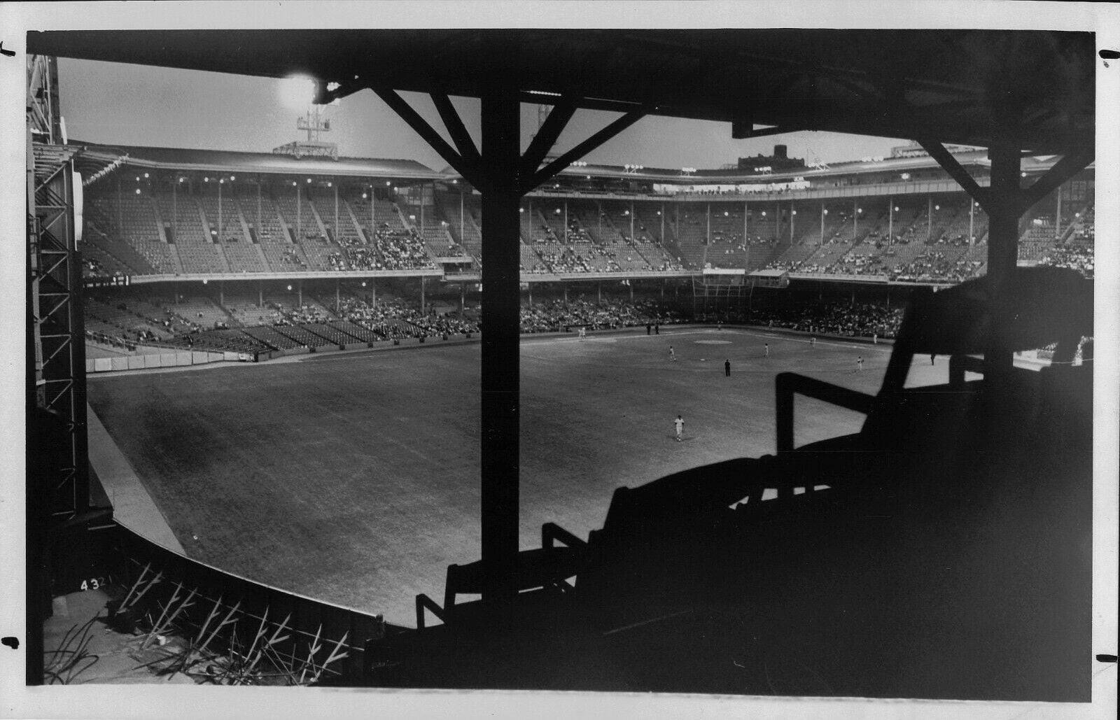 We had a total of 16 members which is our largest group yet for a virtual gathering! We hope to have more in the future. The 2/7 meeting was unique in that we discussed baseball photographs in detail and did some amateur detective work. The first photograph we discussed was an image from the centerfield stands at Connie Mack Stadium, something of a very rare perspective. That image is below.
