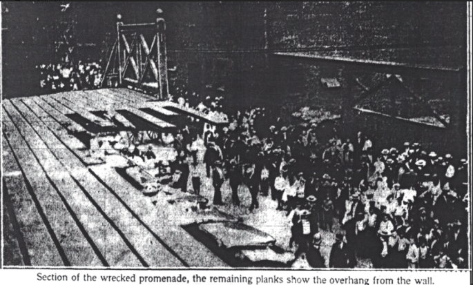 But Ballinger and Rogers, attempting to get ahead of the story, explained to the press why neither could not be the party at fault. Ballinger said “the fault if it lies anywhere .. is not mine”. He pointed to 7 years of weathering and the large crowds supported by his structure over the years. Rogers explained he told Ballinger what he wanted in the park but “the details were left to their superior skill and judgement.” Rogers also pointed out that Ballinger prepared the plans and submitted them, then “went ahead on their task on their own responsibility.”