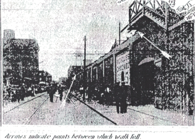 On August 13th the Coroner, empaneled jurors and employees of the Bureau of Building inspection visited the Ball Park. In addition to inspecting the 15th Street walkway the Jury called for a gang of workmen to remove planks and metal covering timbers along the Lehigh Ave and Broad Street promenades. Not a single joist was found to be sound, they were “rotten as punk”.9 The promenades on Lehigh Ave and along Broad Street as far south as the flagpole had been built as part of the same renovations as the 15th Street walkway.10 The Coroner directed the builder, Ballinger & Co., to bring all plans and specifications to the inquest on August 18th.11